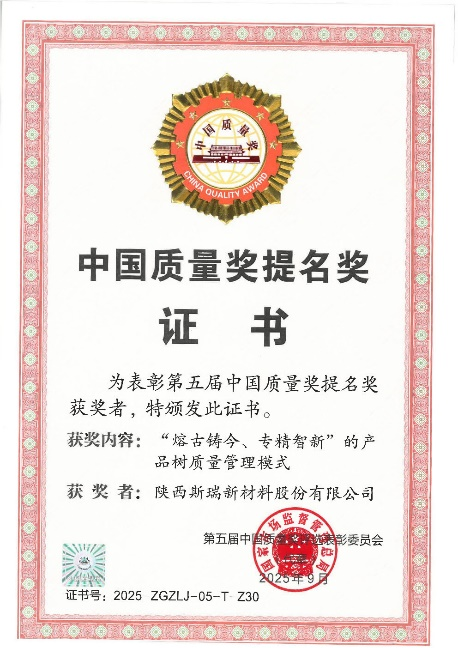 2025年9月16日,中国质量奖评选结果正式揭晓。斯瑞新材凭借“熔古铸今、专精智新”的产品树质量管理模式在651家优秀企业中脱颖而出,荣获中国质量领域的荣誉——中国质量奖提名奖。